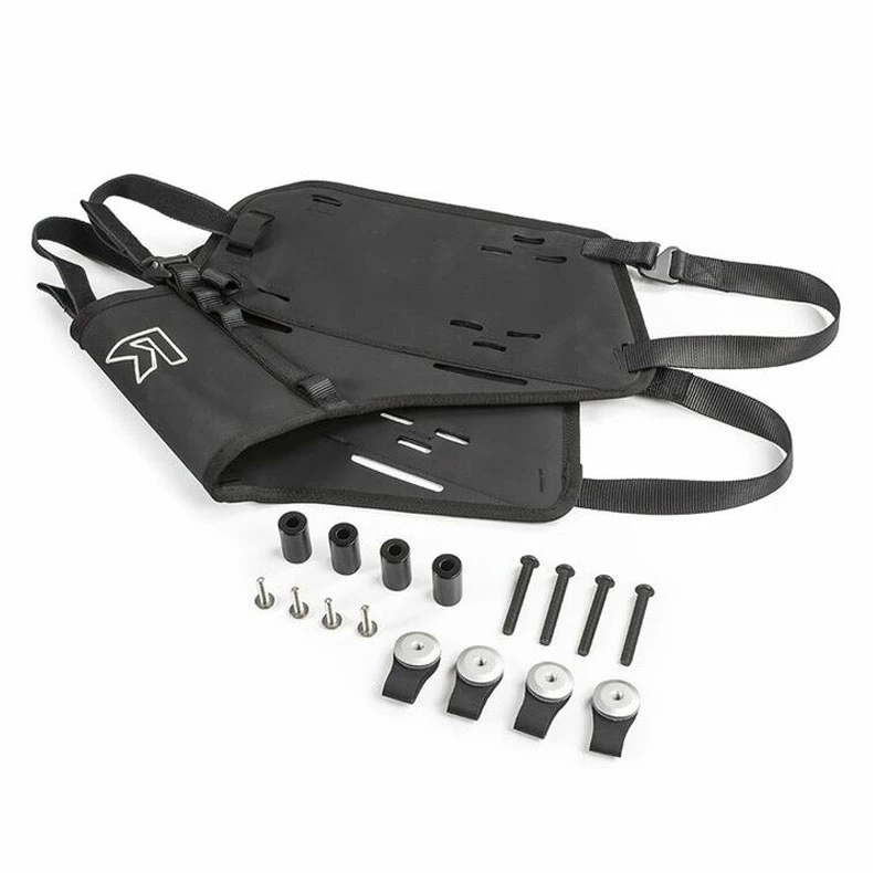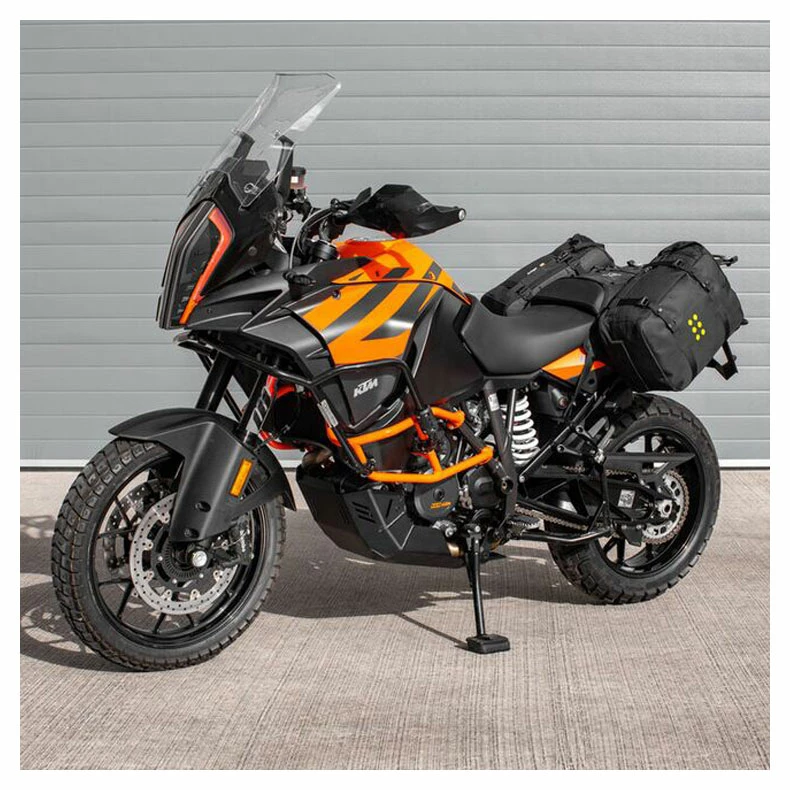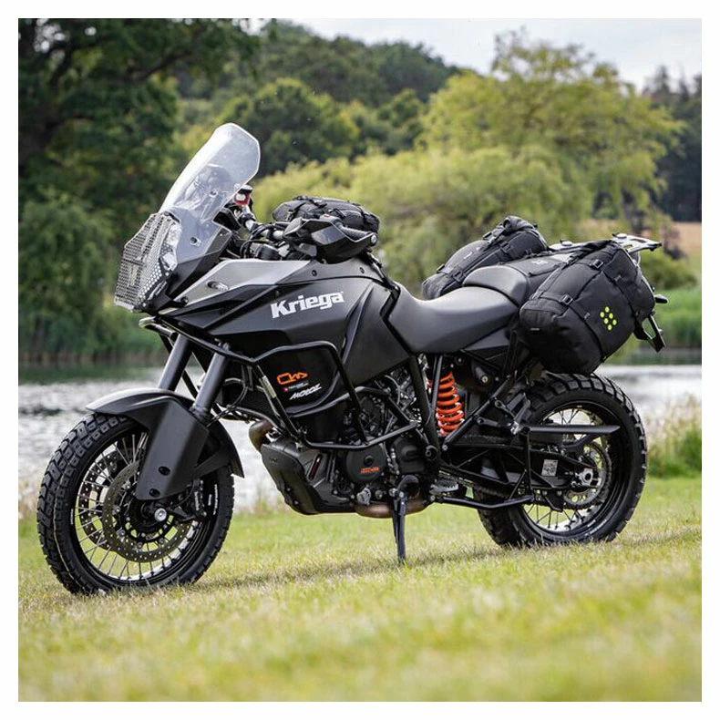 This OS-Base was designed specifically for the big KTM Adventure bikes, and after the initial setup, bags affix to your bike in just a few seconds. It is compatible with Kriega OS-6, OS-12 or OS-18 drypacks. Additional luggage, like your tent and sleeping bag, can be lashed down above the rear fender with included loop mounts. Once you’ve set up camp or reached your hotel, the ladder of which we assume is a rare treat on an otherwise primitive back country journey, the entire system, bags included, can be removed in a matter of seconds.