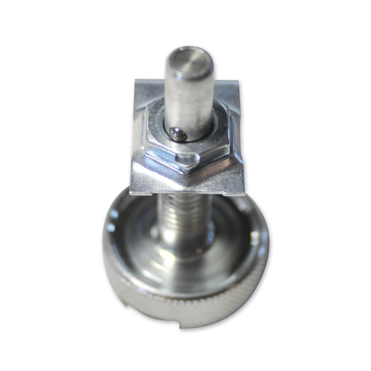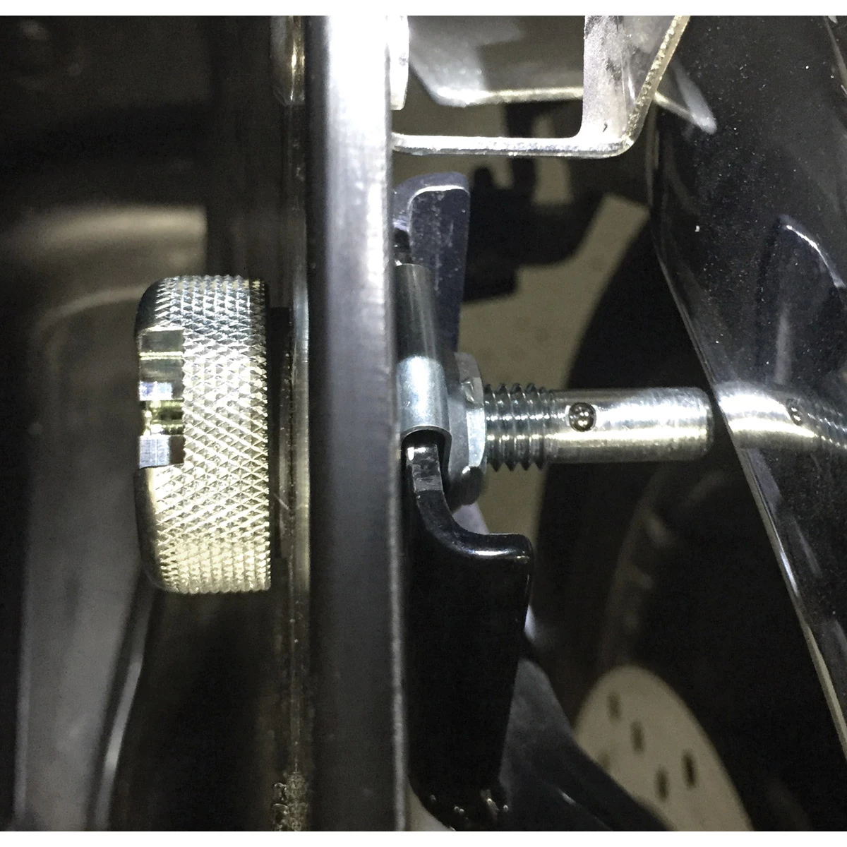 • The genius is in the threaded one piece thumbscrew that has 2 ball detents inserted past the threads of the thumbscrew, once the thumbscrew is screwed in past the bolt you flip the tab down and it locks the 2 balls in the “OUT” position thereby not allowing the thumbscrew to back out due to vibration